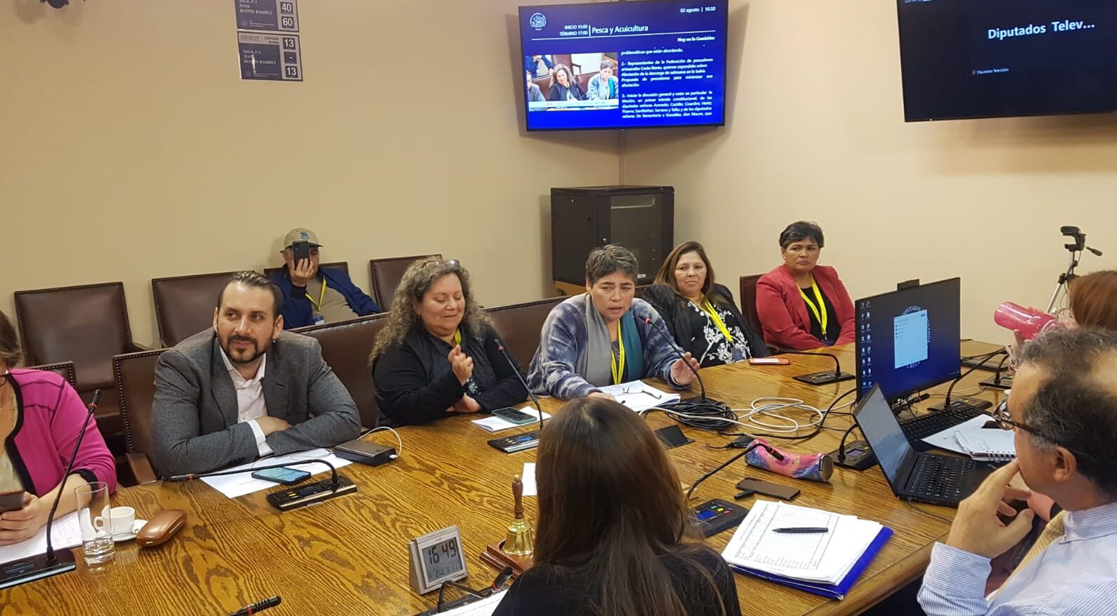 En Comisión de Pesca de la Cámara de Diputados, Zoila Bustamante, presidenta de la CONAPACH, María Torres, presidenta de la Asociación Gremial de Mujeres de la Pesca Artesanal de Chile, “Tejiendo Red” y Paula Reyes, directora de ambas organizaciones; agradecieron el proyecto de ley que otorga una excepción a las mujeres embarazadas de la pesca artesanal, de dos años adicionales al periodo que otorga actualmente la ley de caducidades de Registros Pesqueros Artesanales.